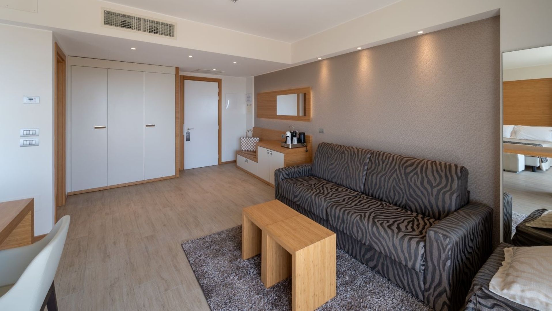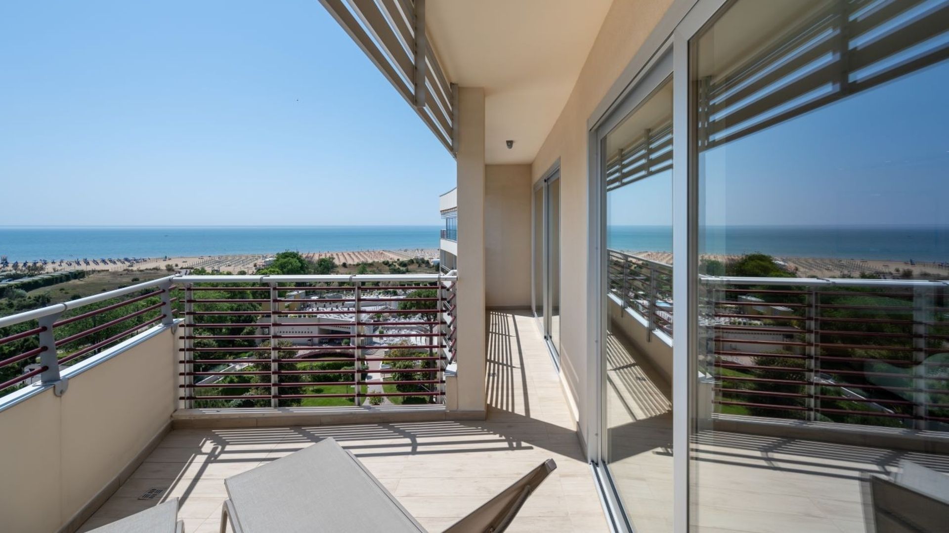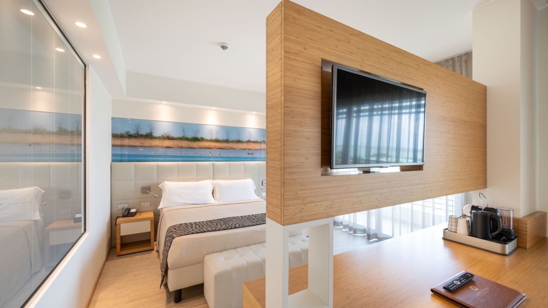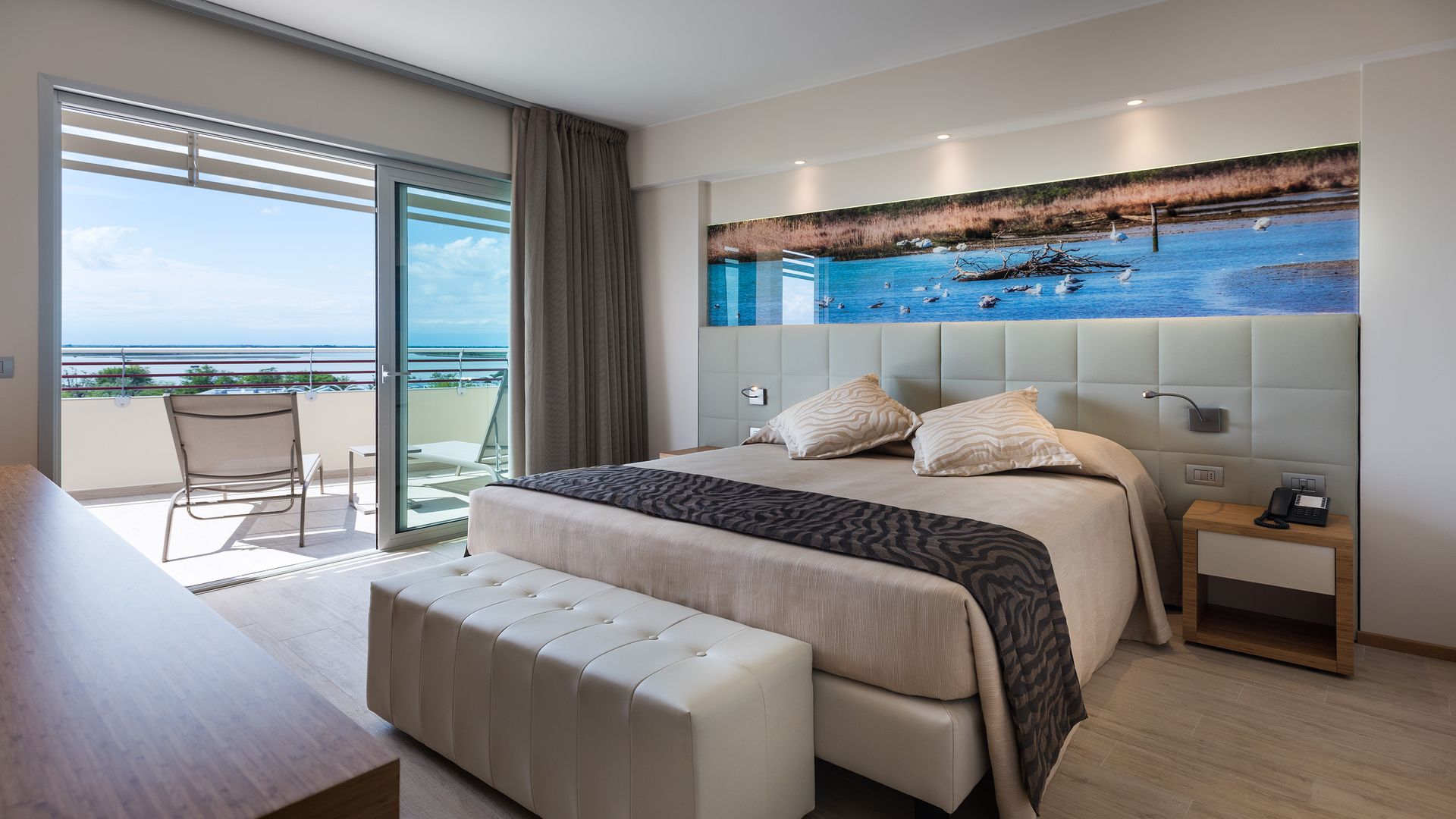 Concedetevi il lusso della vostra camera LAGUNA: esclusiva junior suite al 7° ed ultimo piano con vista sul mare oppure sugli incredibili colori della laguna di Bibione.